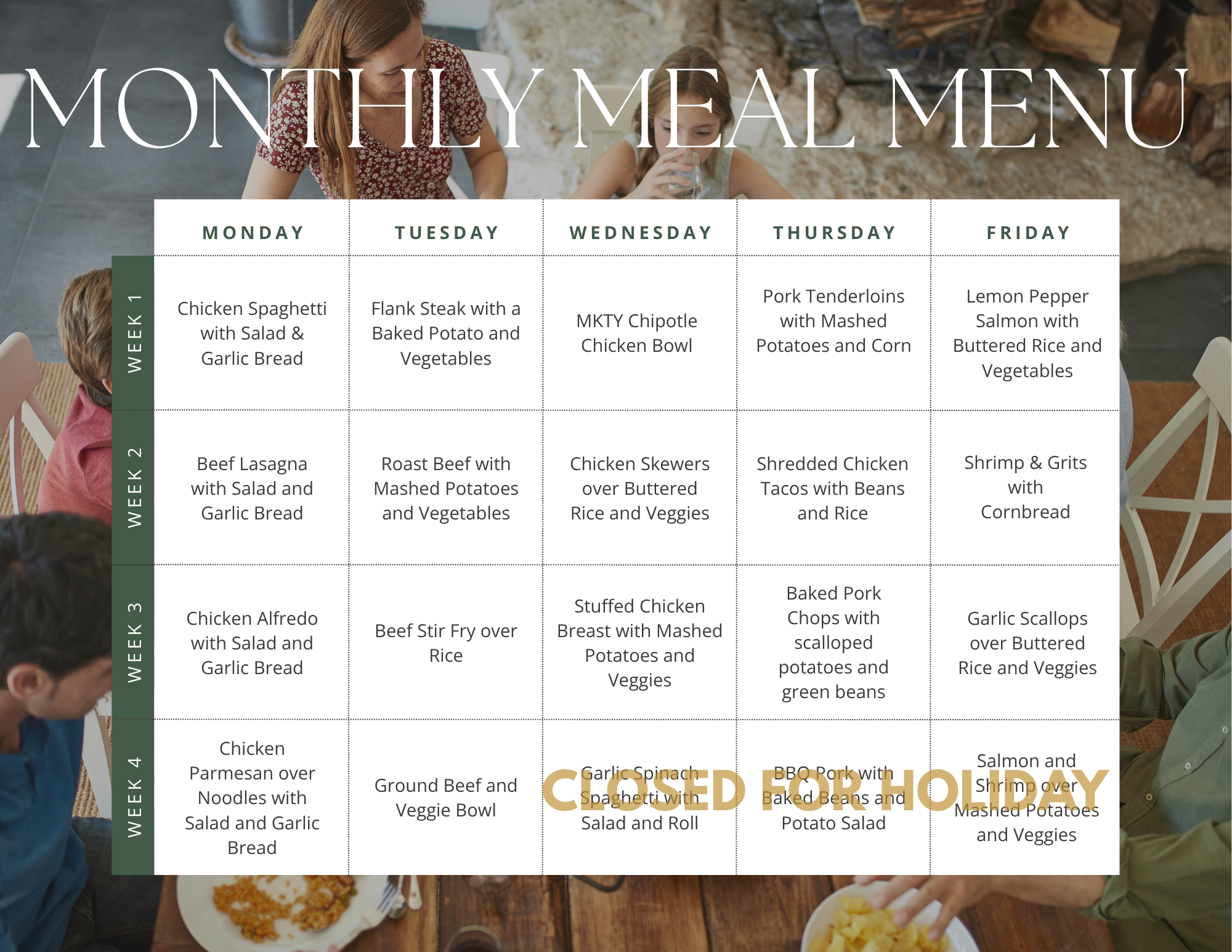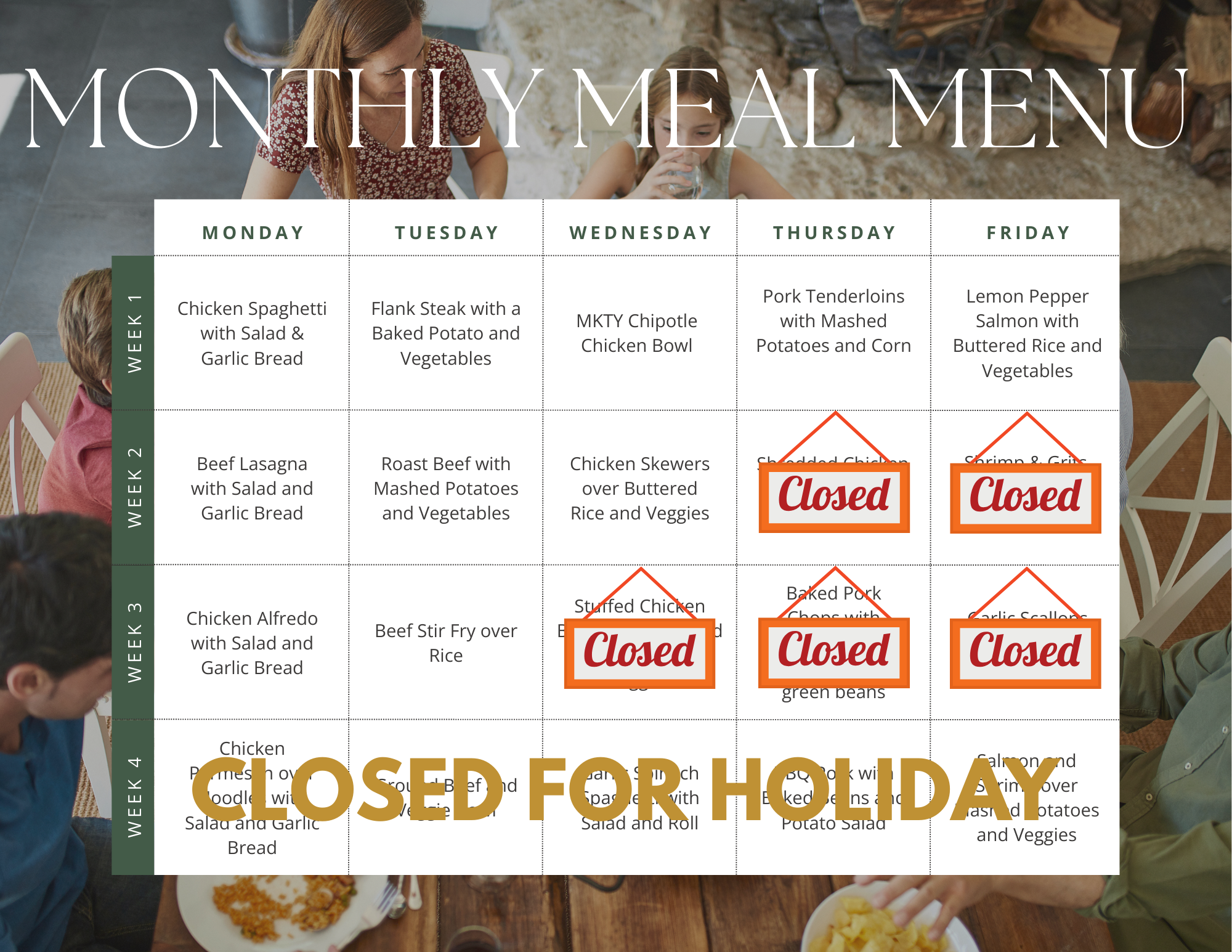 - Monday - Beef Lasagna with Salad and Garlic Bread